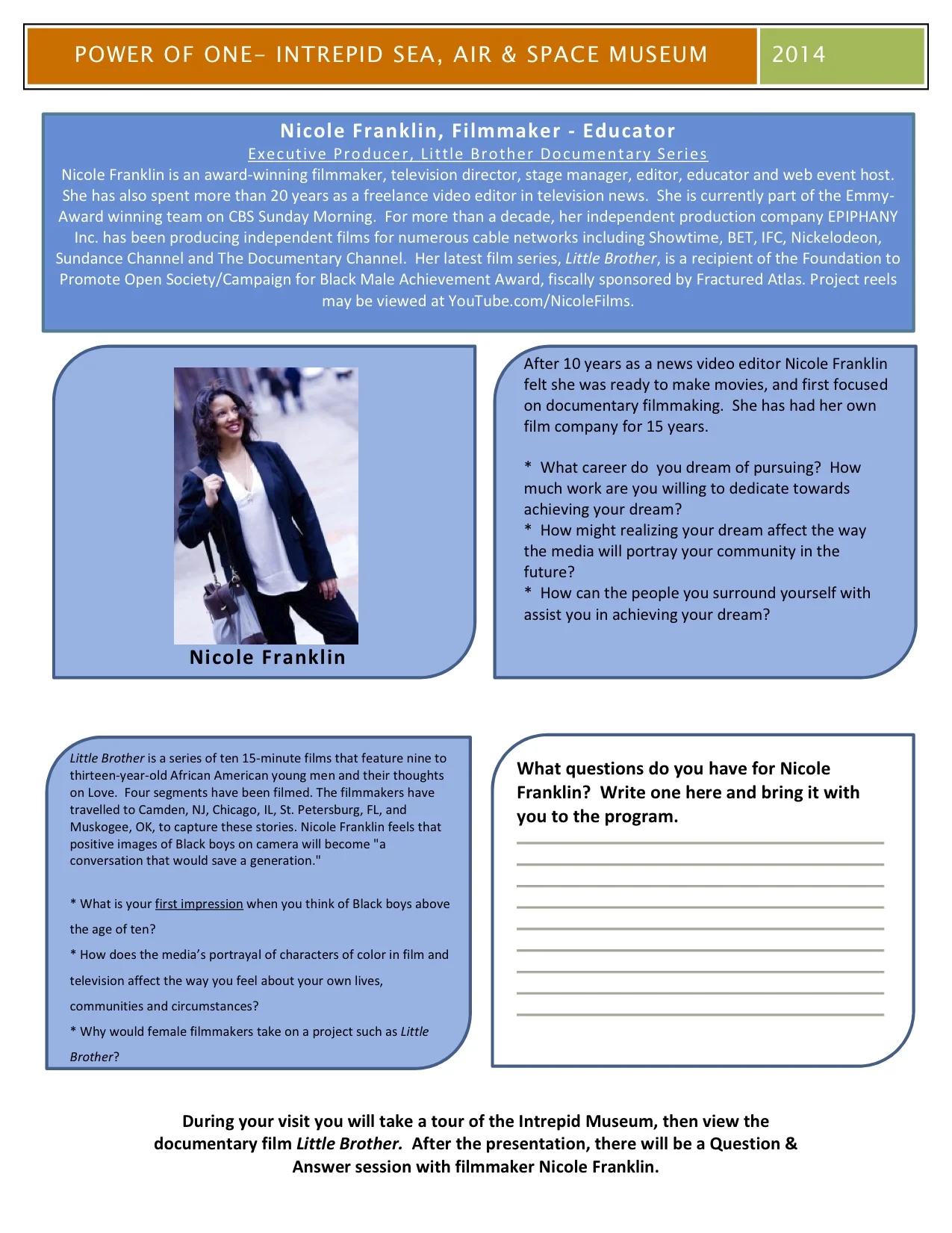 "As productive citizens we exist to galvanize a community, expose injustice, celebrate achievement and bring joy." -Nicole Franklin, featured speaker for the Power of One Speaker Series for The Intrepid Sea, Air & Space Museum.